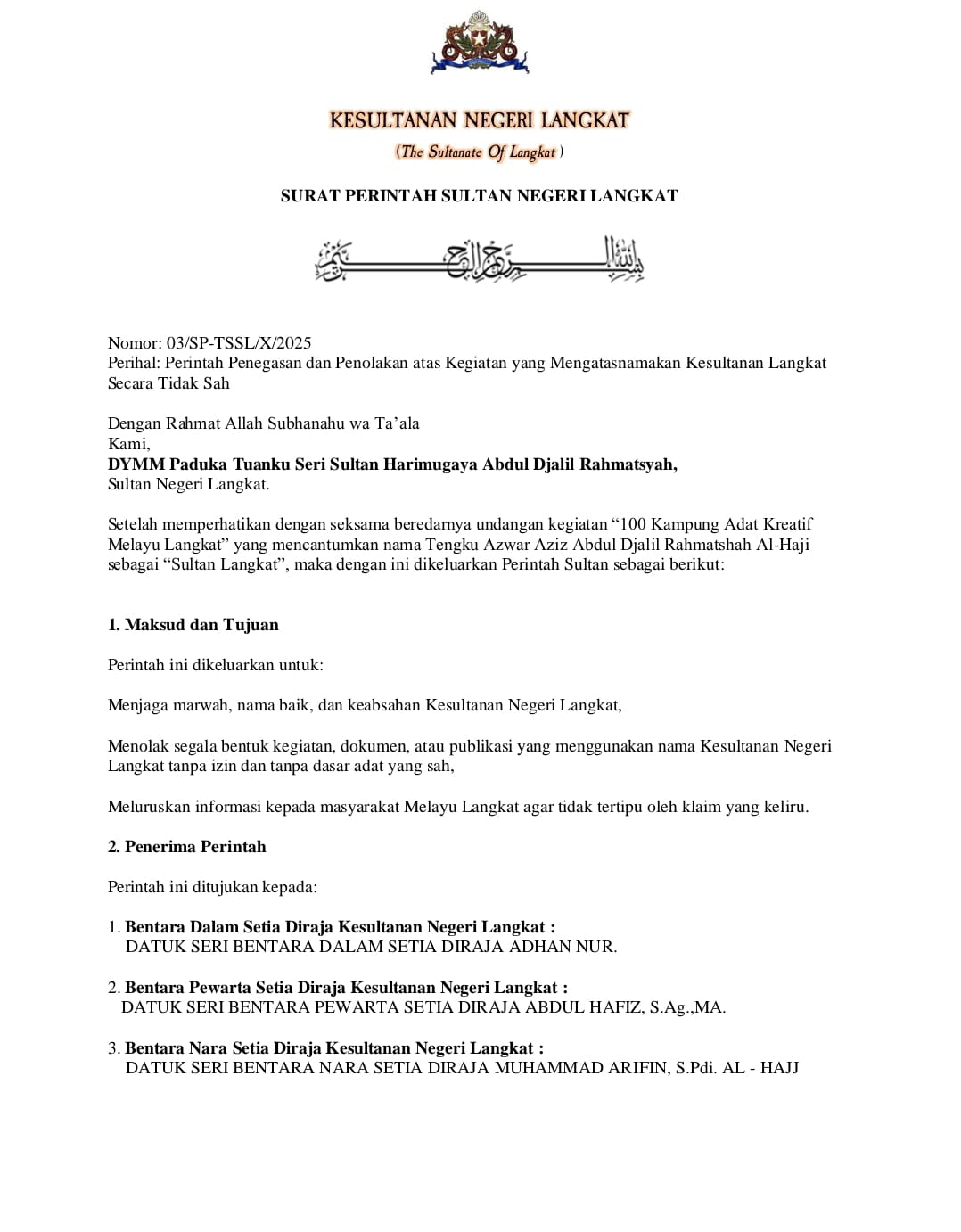 Langkat – Kesultanan Negeri Langkat resmi mengeluarkan Surat Perintah Sultan Negeri Langkat Nomor: 03/SP-TSSL/X/2025 yang berisi penegasan dan penolakan terhadap kegiatan yang mengatasnamakan Kesultanan Langkat tanpa izin resmi dan dasar adat yang sah.